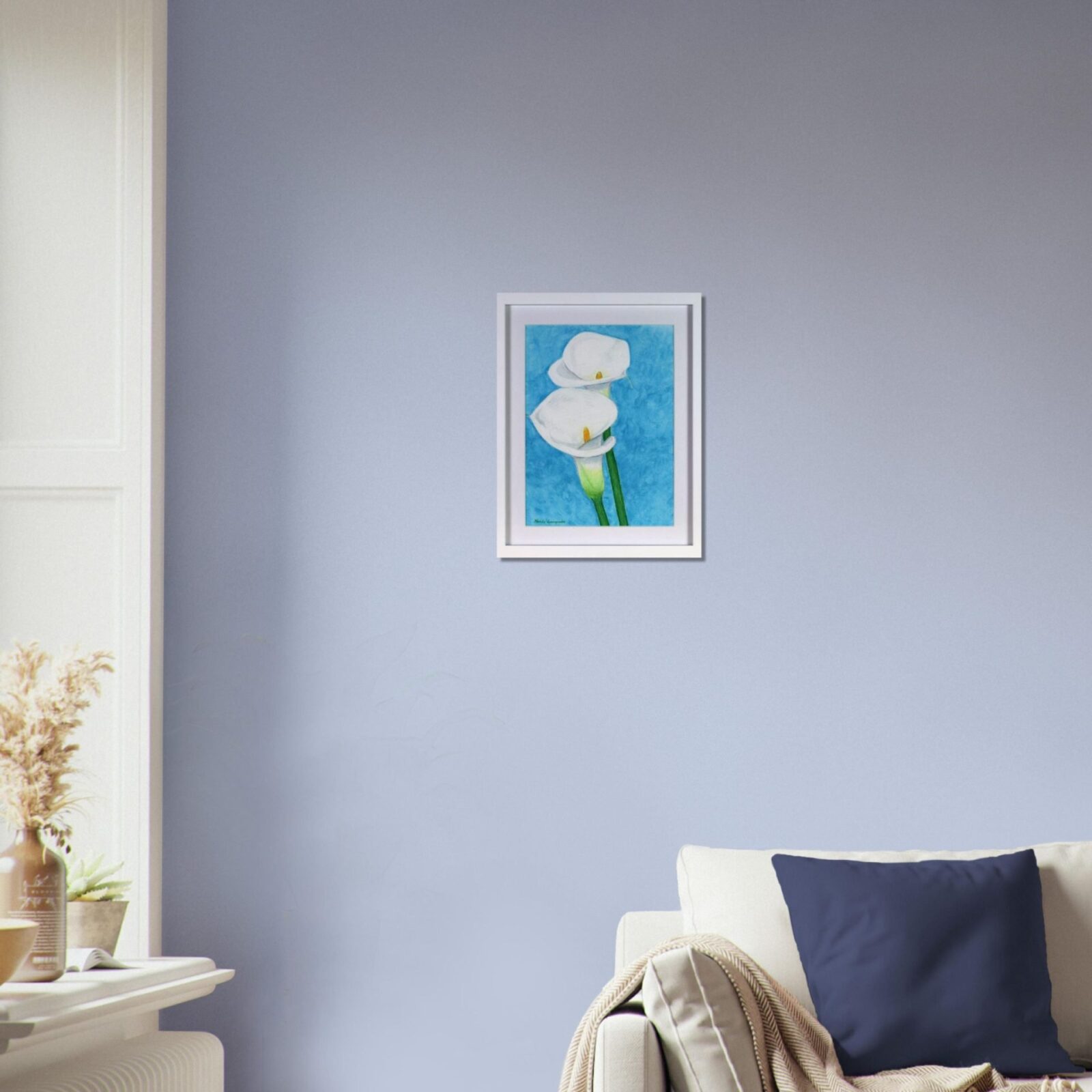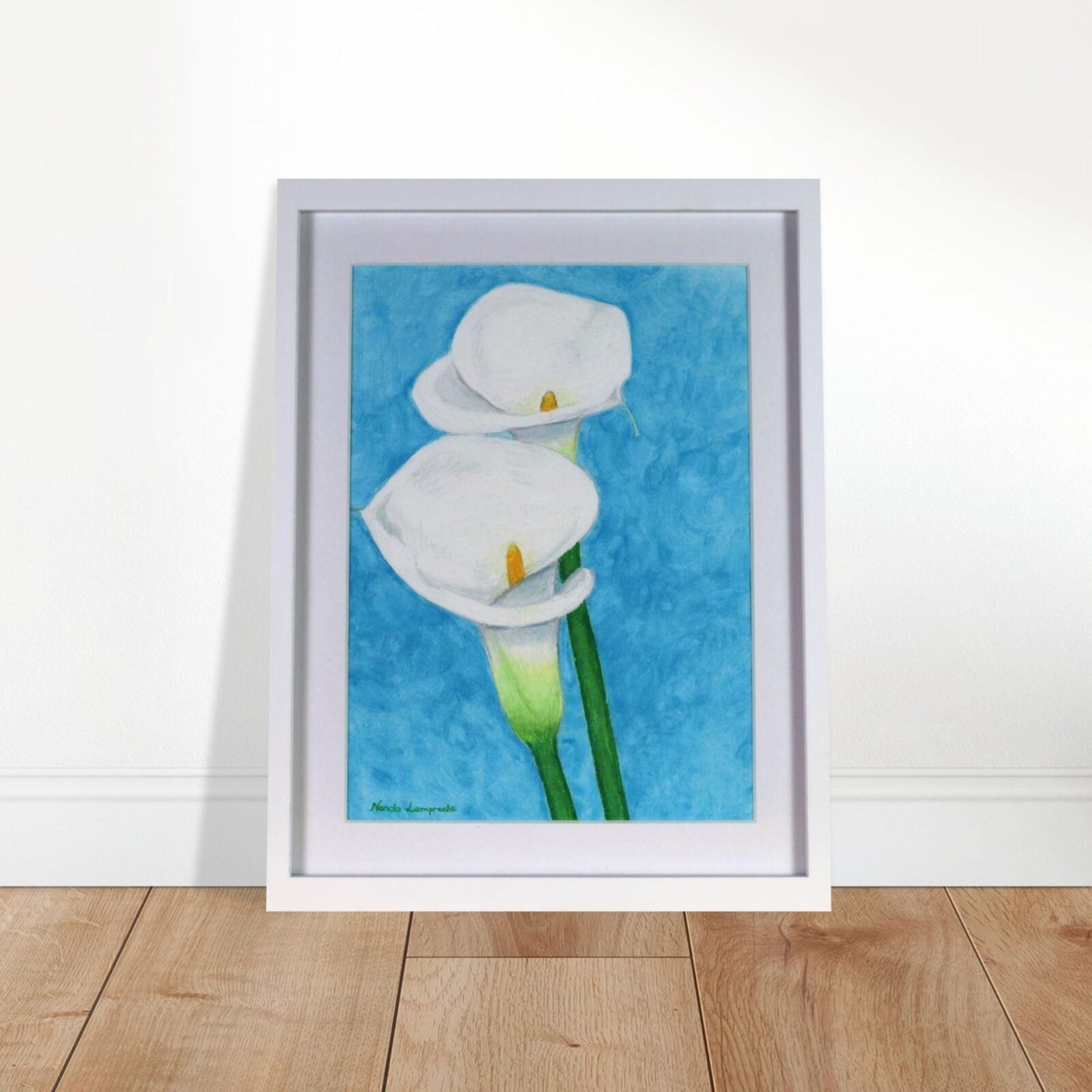 “Tranquility” by Nanda is an original mixed media artwork (12×9″, framed 15.16×12.2″). Featuring two white arum lilies with subtle grey and green undertones against a serene baby and sky blue background, it evokes peace and is ready to hang in your minimalist or coastal space.