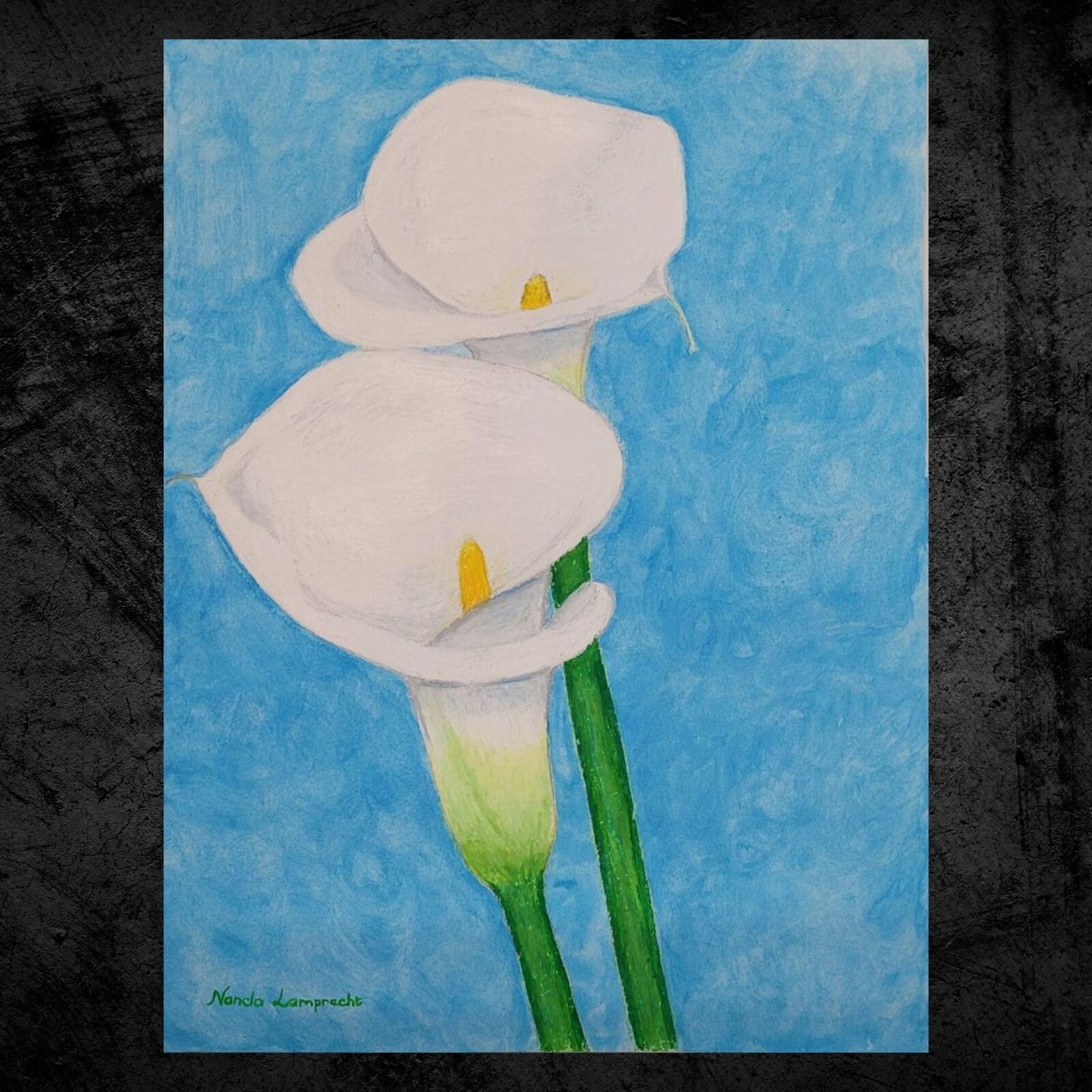 Nanda’s intention was to promote a sense of tranquility and serenity with this piece. It features two graceful white arum lilies with green stems, standing elegantly against a soothing background. The background is painted in shades of blue, specifically a calming mix of baby blue and sky blue, exhibiting a watercolor wash effect that is mostly smooth looking. When observed closely, the white lilies reveal subtle undertones of grey and green, adding depth and realism to their pristine appearance.