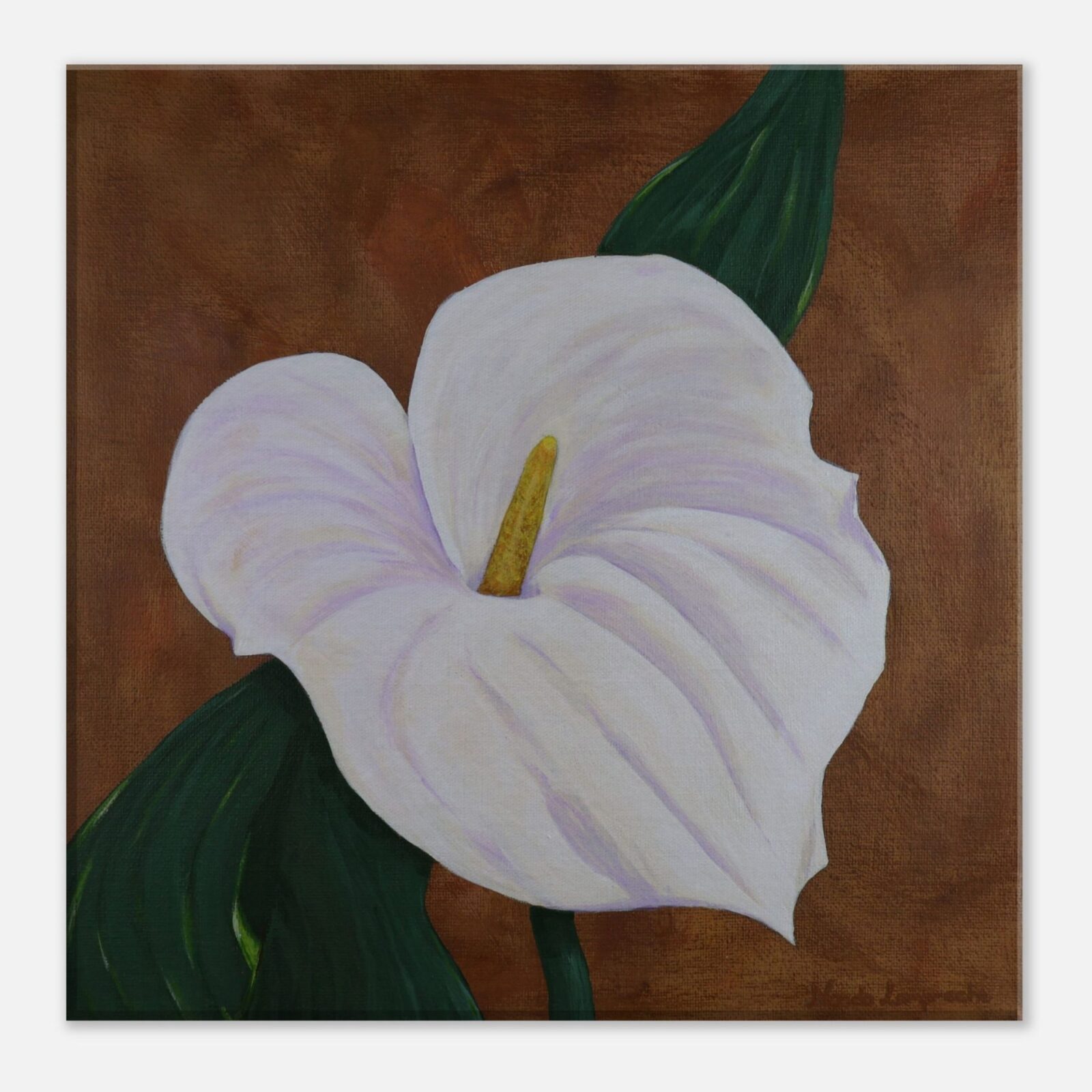 “Arum Lily” by Nanda is a 12×12″ original acrylic painting. It captures the simplistic elegance and natural beauty of a single white lily with hints of pink and yellow, set against a warm, earthy brown background.