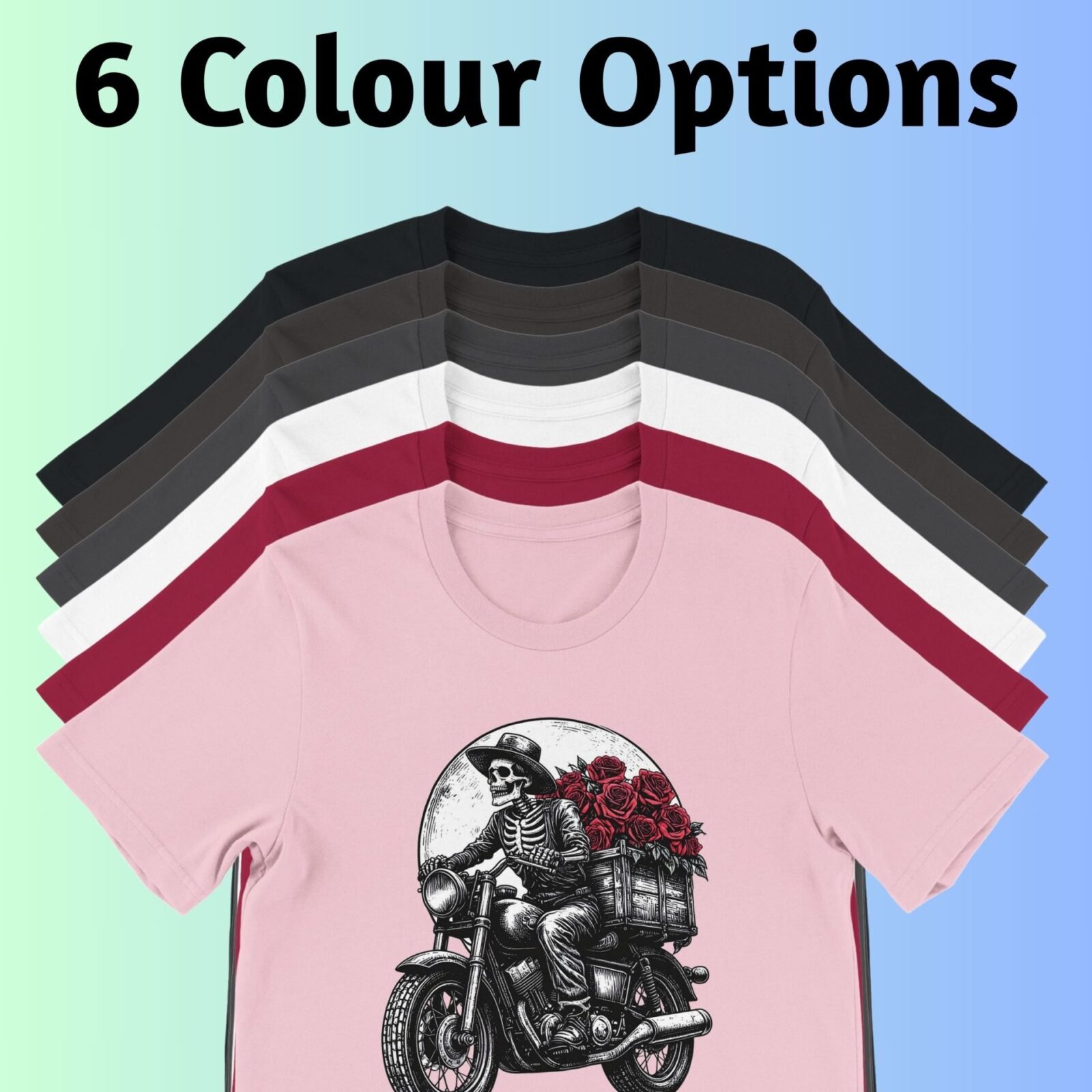This gothic style biker t-shirt brings bold attitude and eerie elegance together in one unforgettable design. Featuring a grinning skeleton behind the bars of a rusted motorcycle and a weathered wooden crate overflowing with vivid red roses, this shirt tells a story of rebellion, romance, and the road beyond. The iconic “Bikes N Roses” text (can be personalised) completes the scene, making it the ultimate dark aesthetic tee for alternative souls.