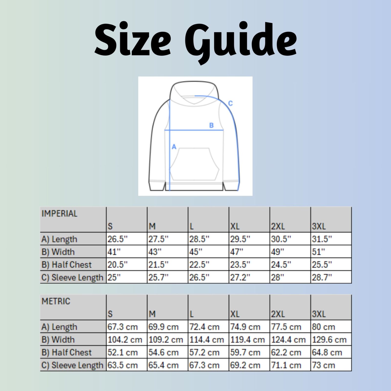 | Size | A) Length | B) Width | B) Half Chest | C) Sleeve Length |