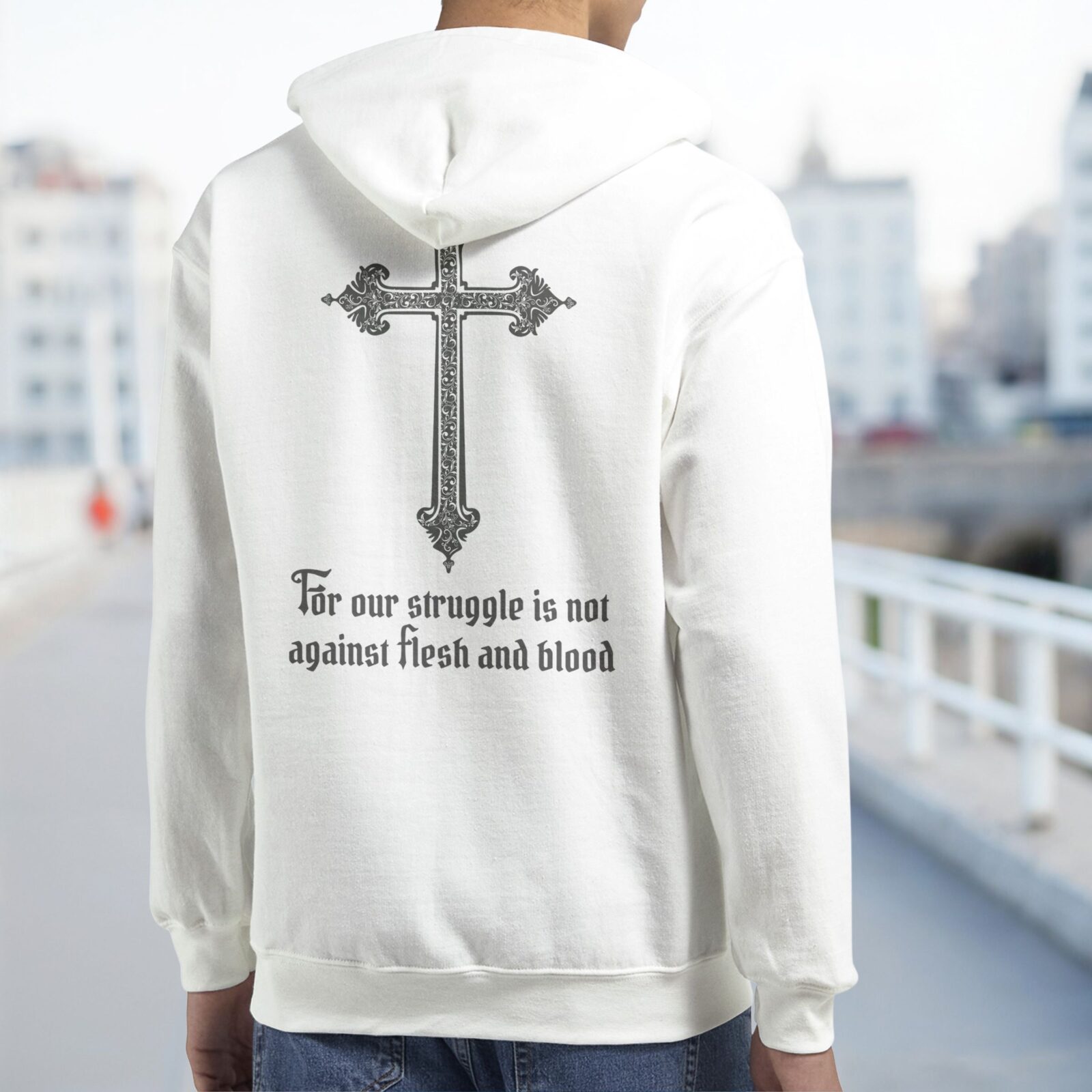 This Christian zip hoodie features the powerful Bible verse, “For our struggle is not against flesh and blood,” offering a bold declaration of faith and spiritual truth. Designed for believers who want to wear their faith with confidence, this hoodie blends comfort, meaning, and timeless Christian style.