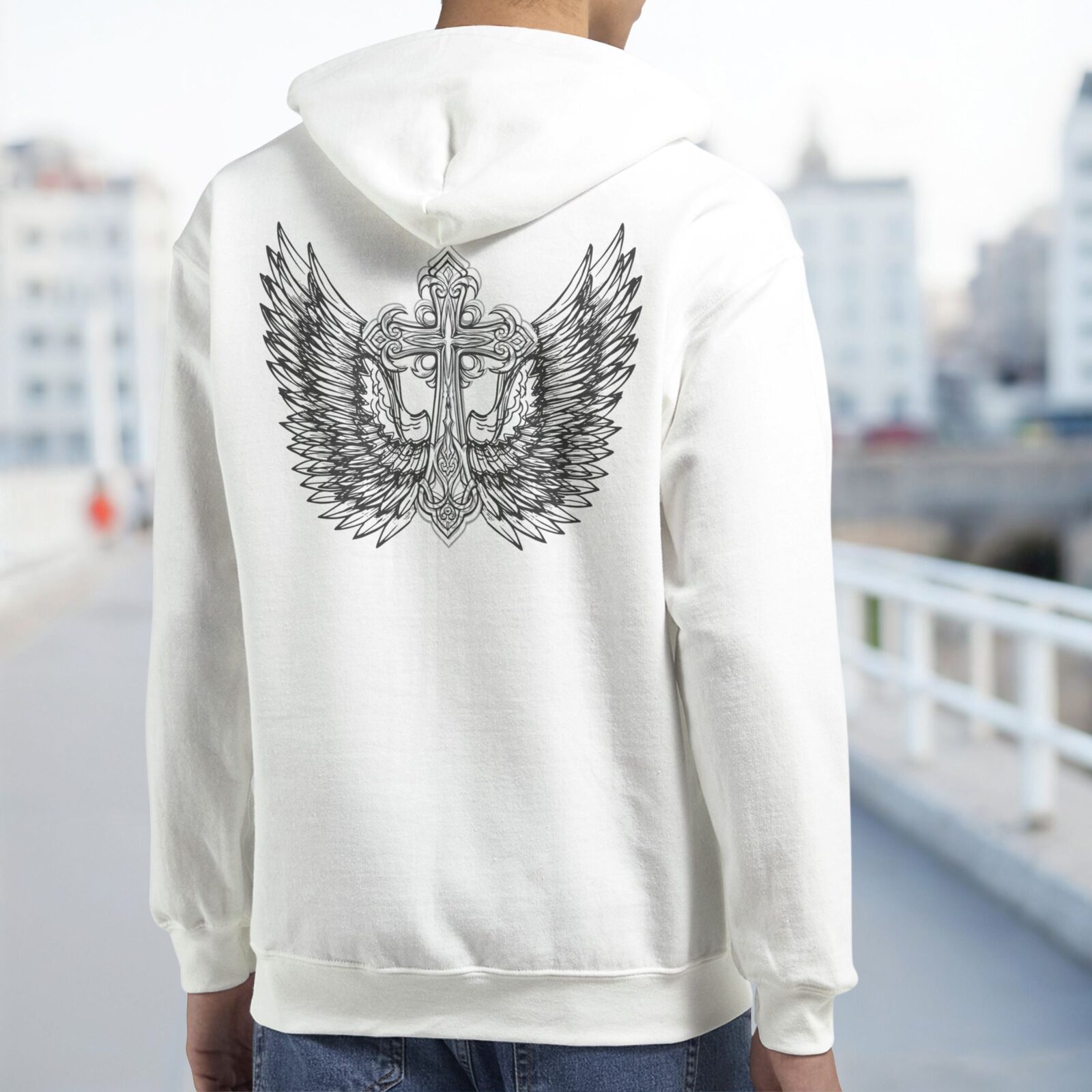 - Christian zip hoodie with cross and wings design