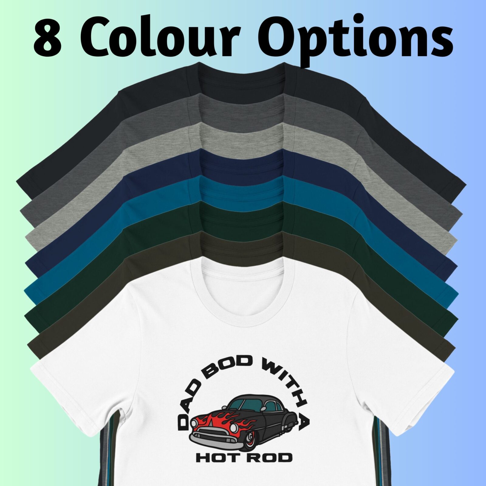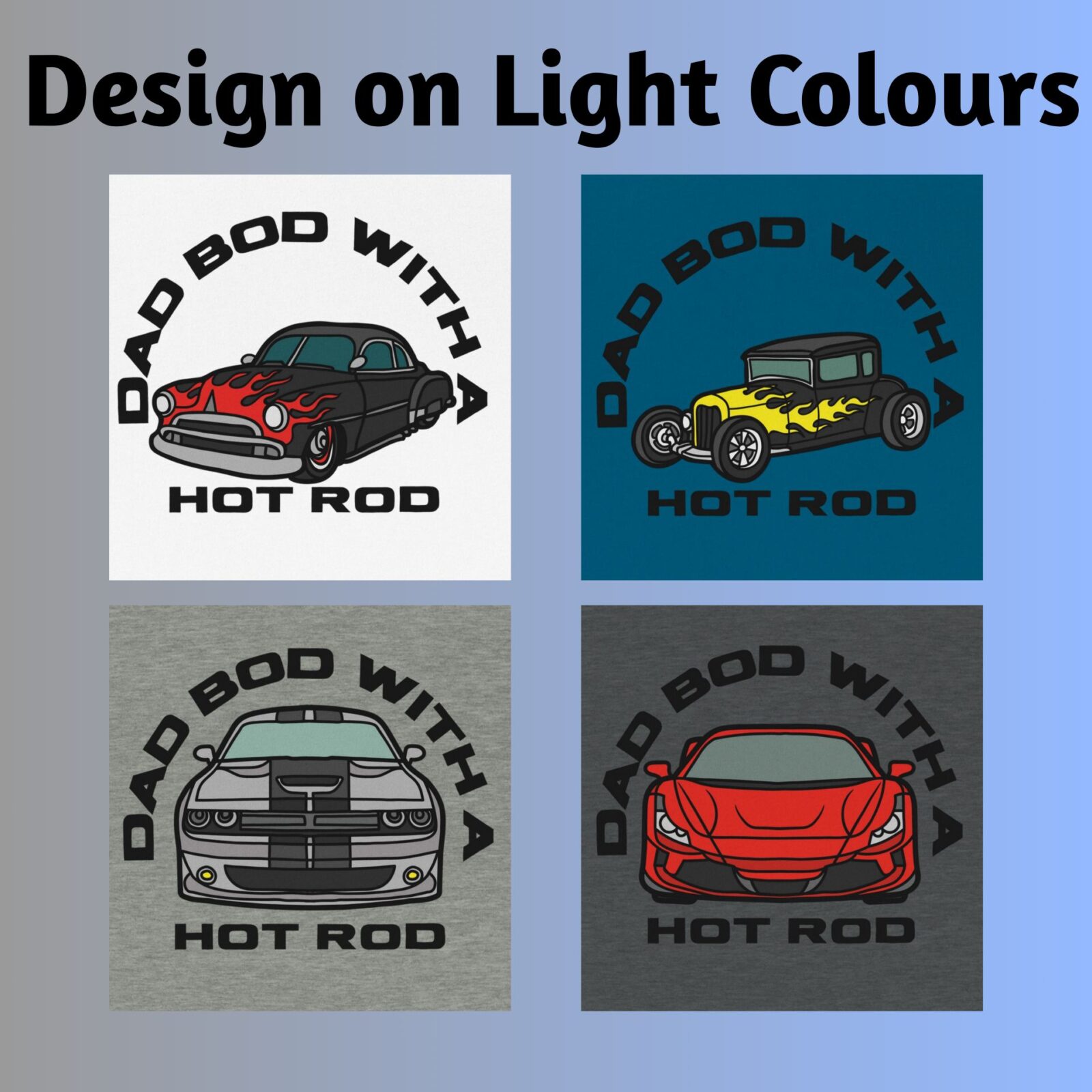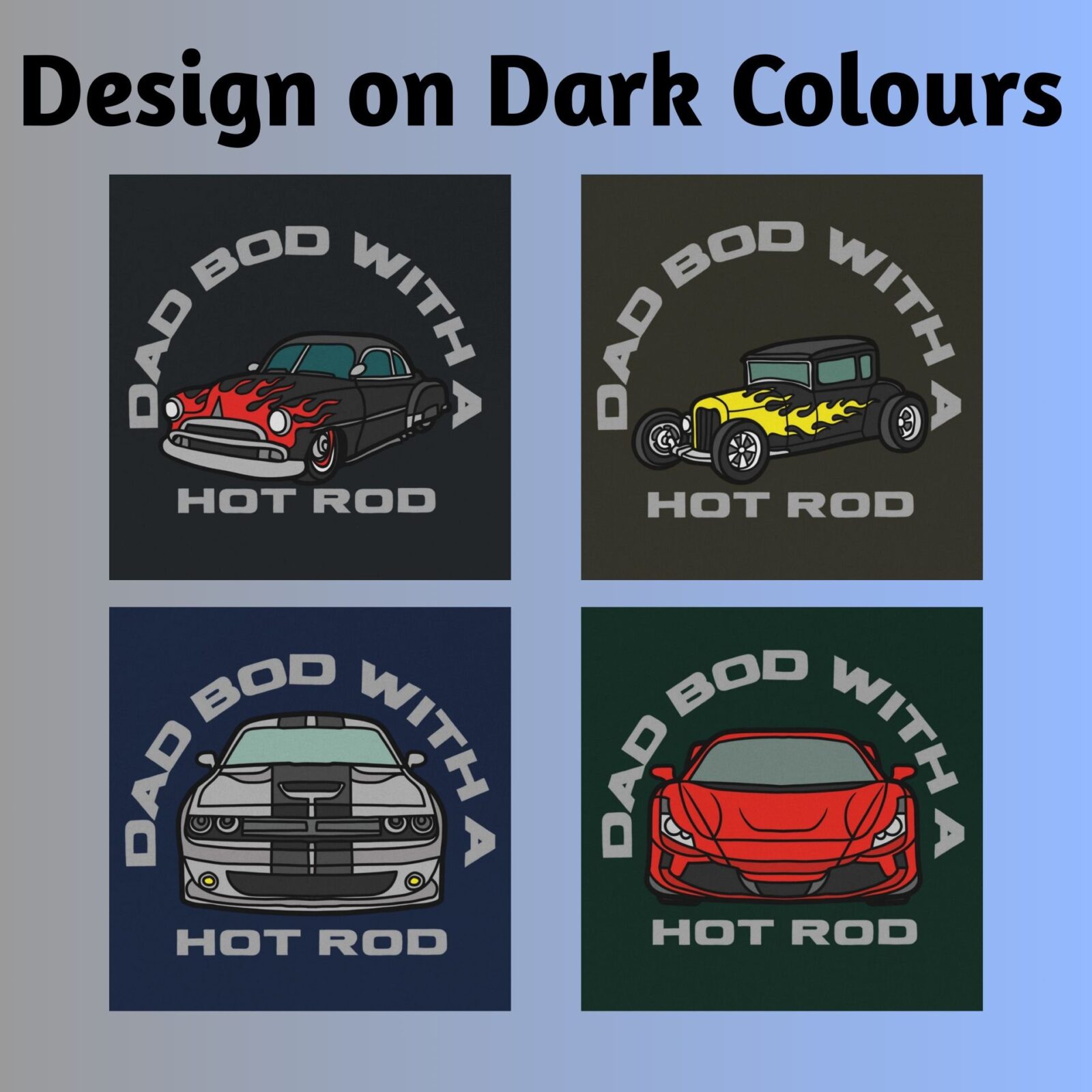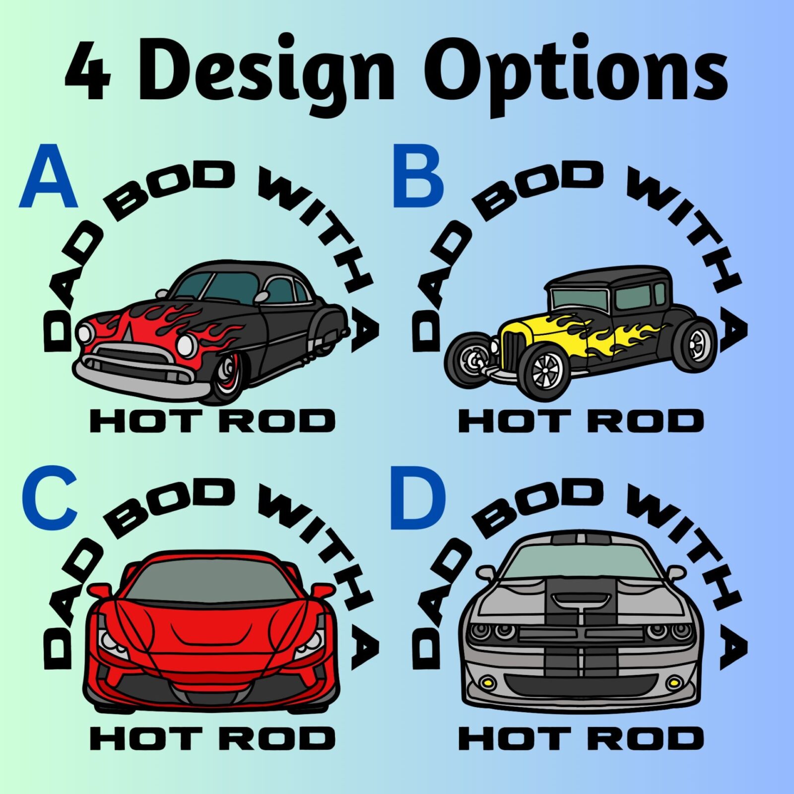 • Text: Dad Bod with a Hot Rod + detailed car graphic