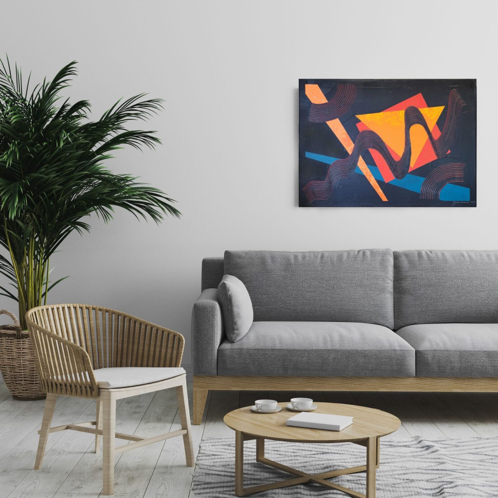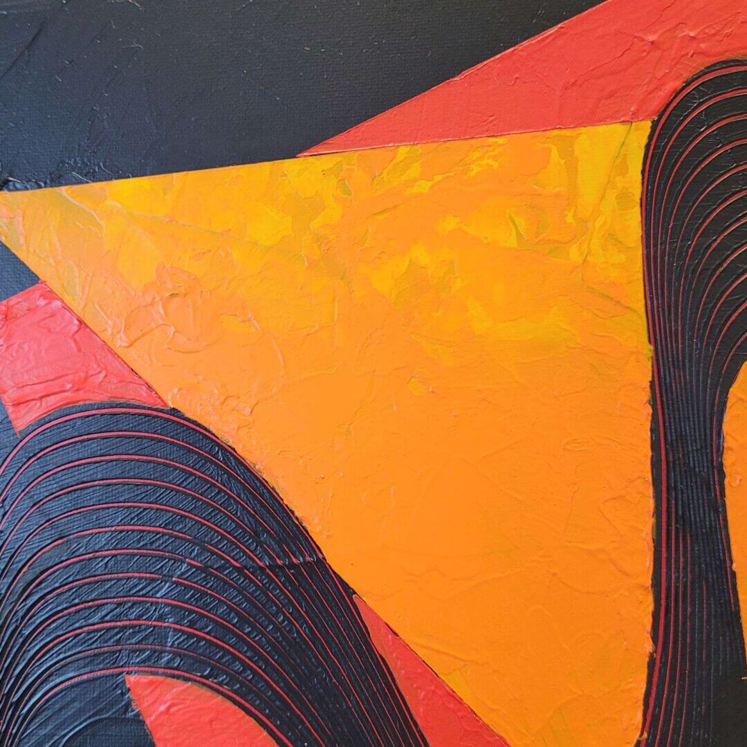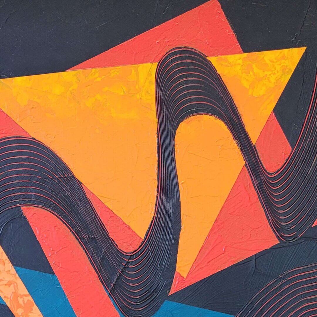 Unleash “Energizing,” Nanda’s 18×24″ original retro abstract acrylic painting. Bold red, orange, and a bright blue streak burst from a textured matte black, layered with dynamic black waves and scratched details that embody urban energy.