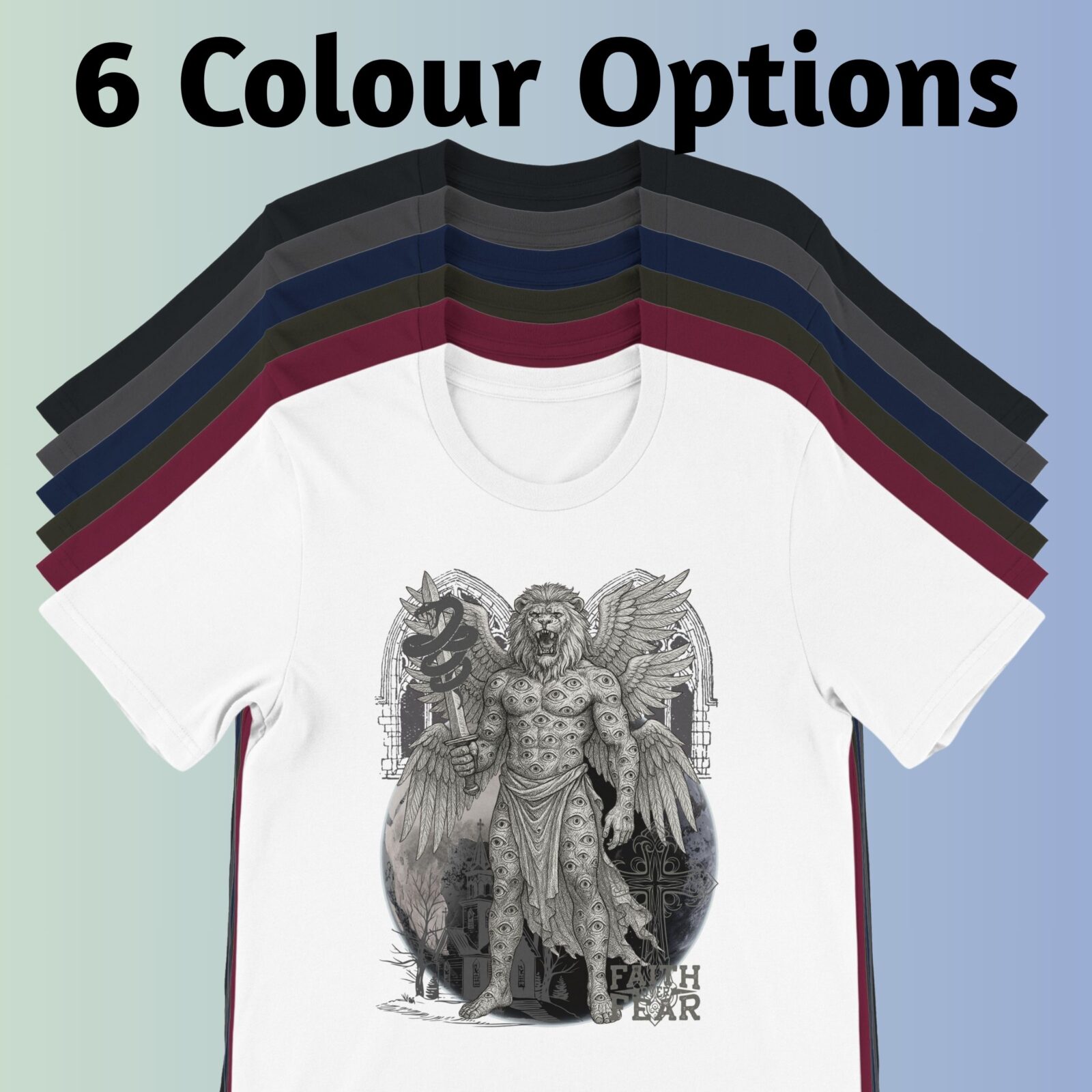 Wear your faith like armour with this Faith Over Fear Christian Gothic unisex t-shirt — a powerful design inspired by the heavenly angelic beings described in Scripture. Featuring a lion-headed angel with six wings, a sacred church, a globe representing creation, and intricate Victorian arches complemented by a cross, this shirt captures the essence of divine strength and courage.