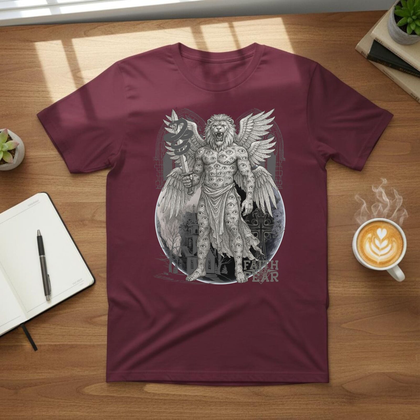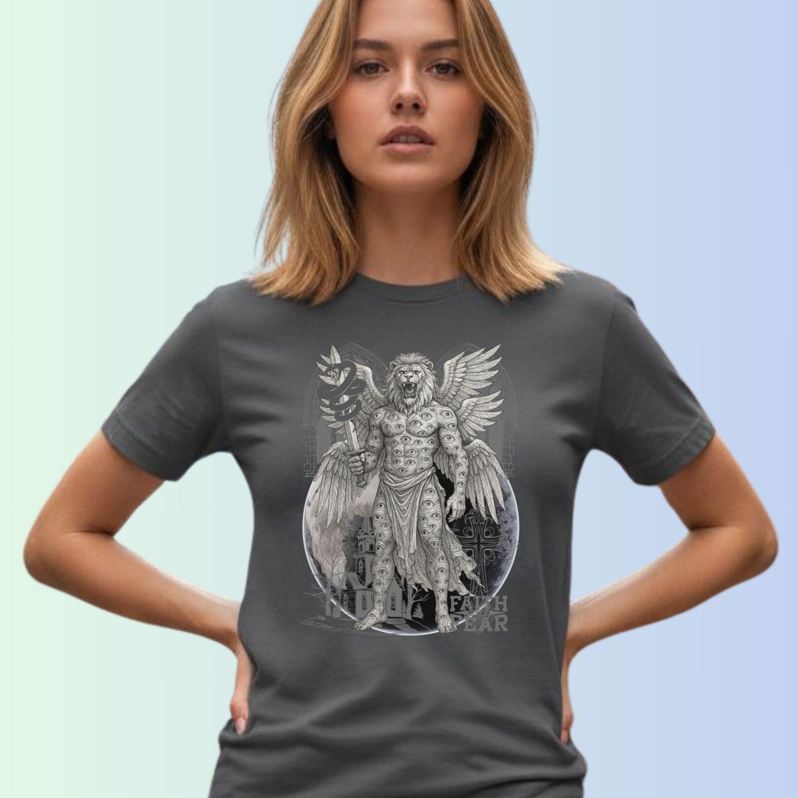 Faith Over Fear Christian Gothic Angel Shirt, Lion-Headed Seraph Wings Cross Tee, Unisex Faith Streetwear, Religious Art Top