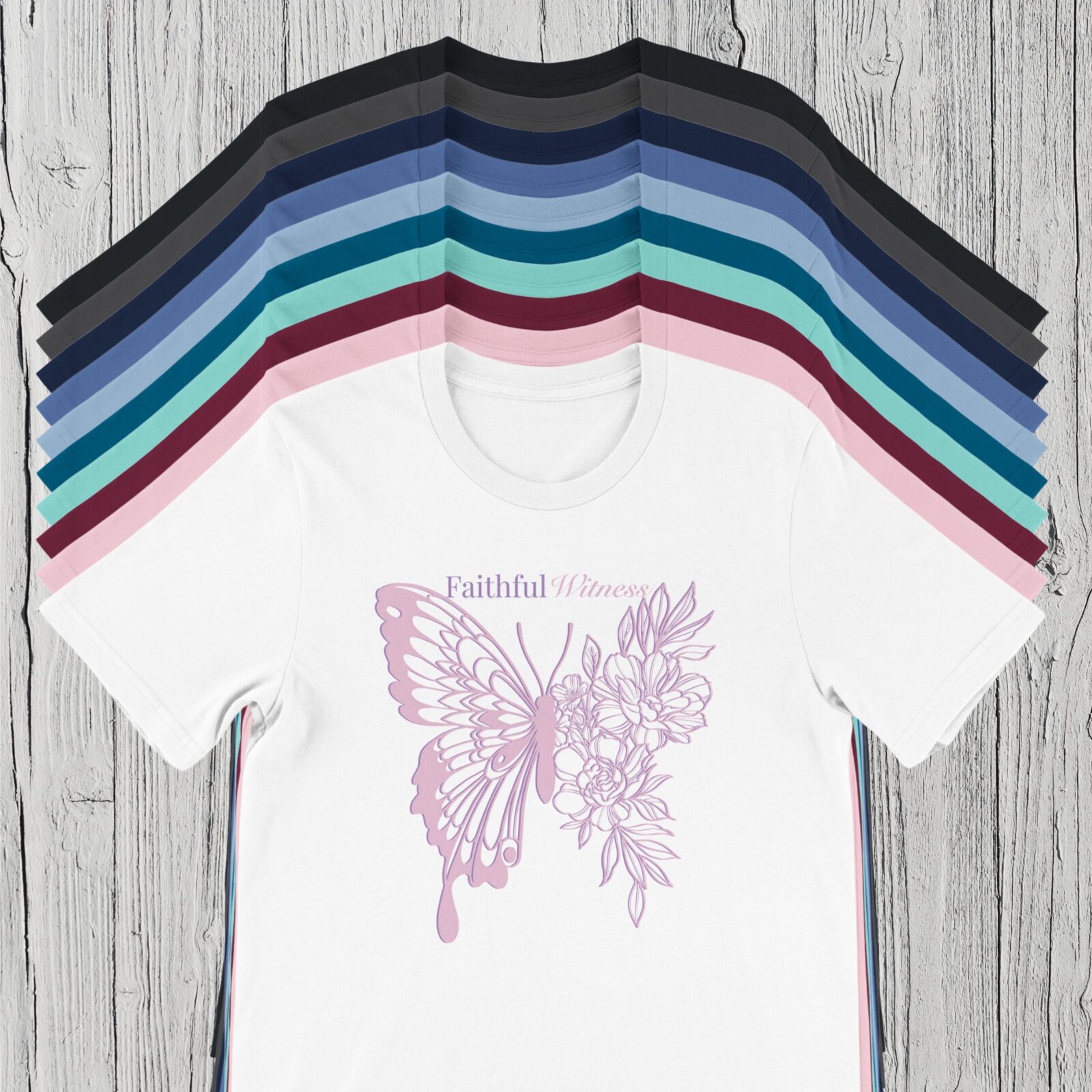 Express your faith with confidence in this beautifully designed Christian women’s t-shirt featuring a butterfly and floral motif with the message Faithful Witness.