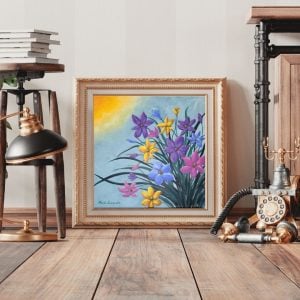 Ignite your space with the bold energy of the “Fire Daisies” canvas print by Nanda. This captivating wall art piece is a high-quality reproduction of Nanda’s original acrylic painting, designed to bring its vibrant charm to your home or office. Available in two versatile square sizes, 16″ x 16″ or 20″ x 20″, you can choose the perfect fit for your space.