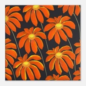 Each “Fire Daisies” canvas print is produced on a premium cotton-polyester blend (300–350 gsm, 350–400 microns), ensuring excellent detail and color reproduction that faithfully captures the original artwork’s vividness. The canvas is meticulously stretched over responsibly sourced FSC-certified wood stretcher bars, with options for either a slim (2cm/0.75in) or thick (4cm/1.5in) depth to suit your aesthetic preference.
