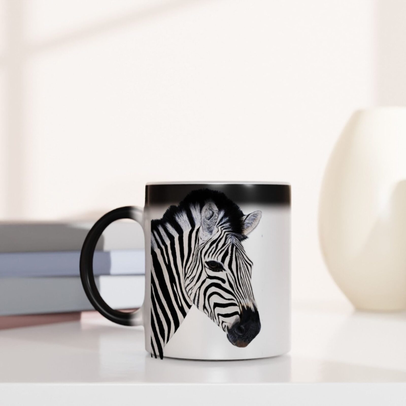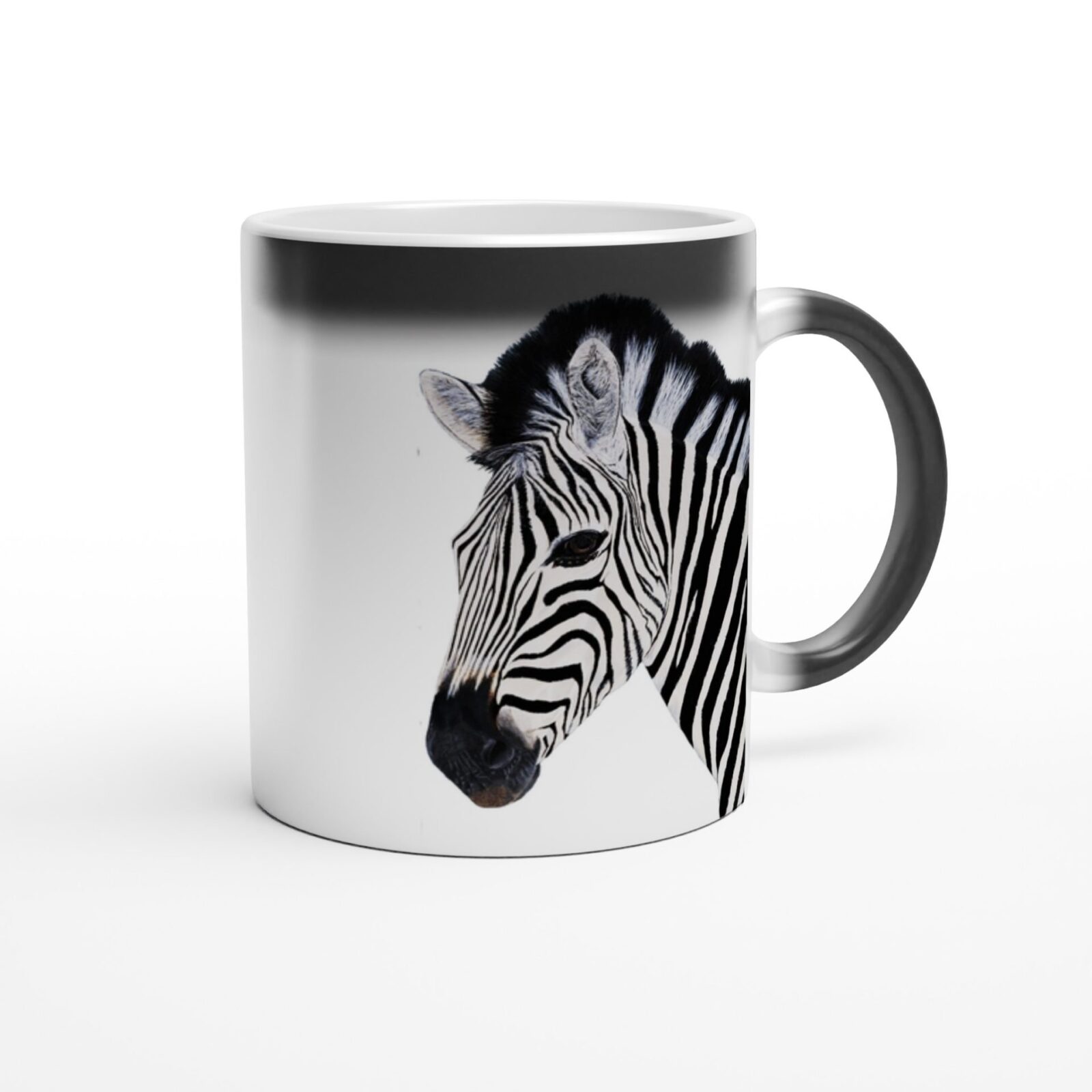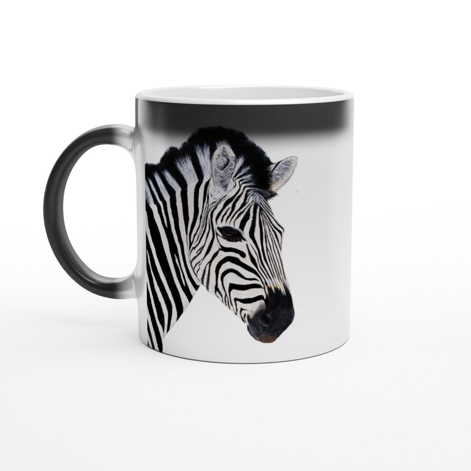 Experience the magic of our colour-changing ceramic mug! It transforms from a sleek black glossy finish to a striking black and white zebra design with hot liquid. Handwash only, not microwave-safe. Perfect for any hot drink!