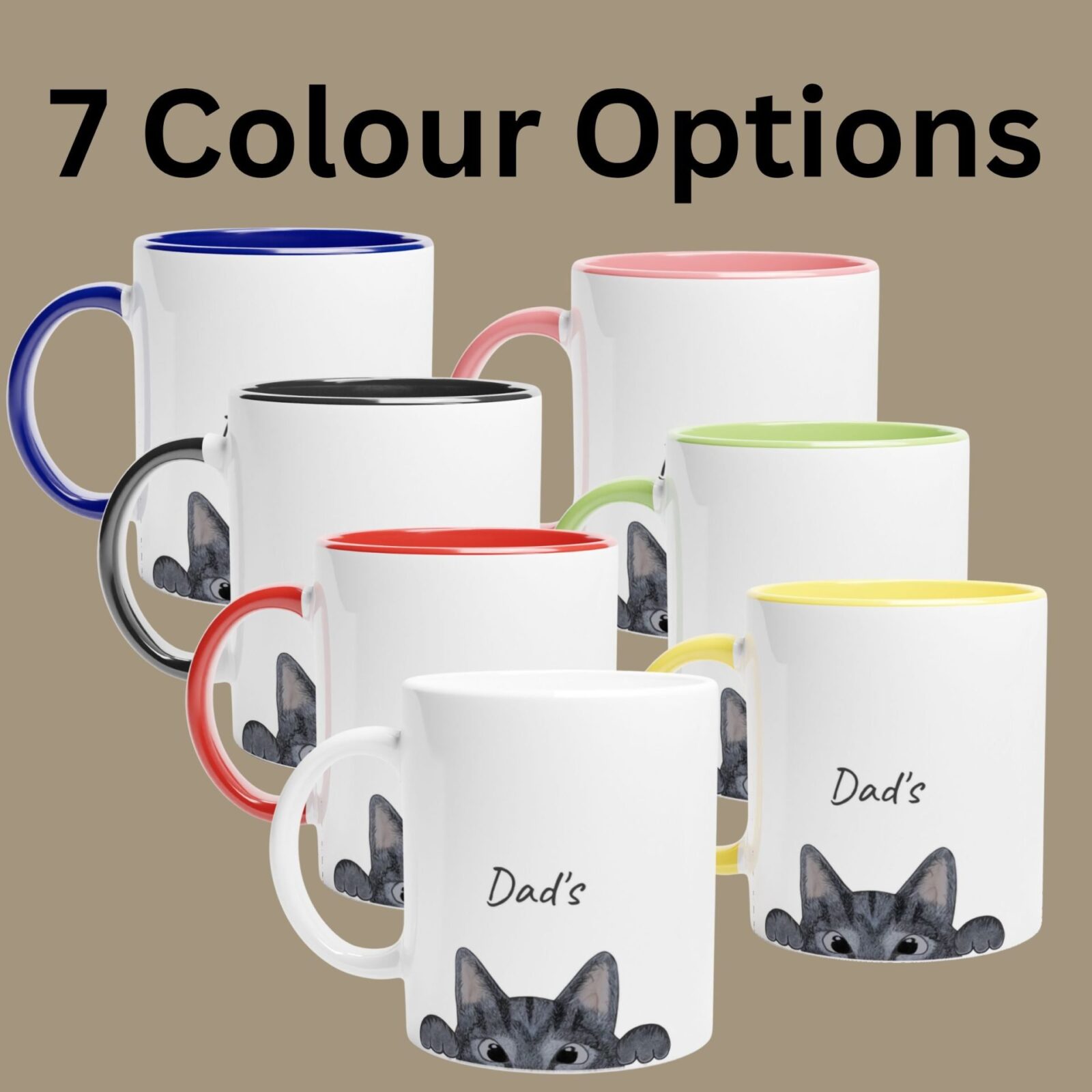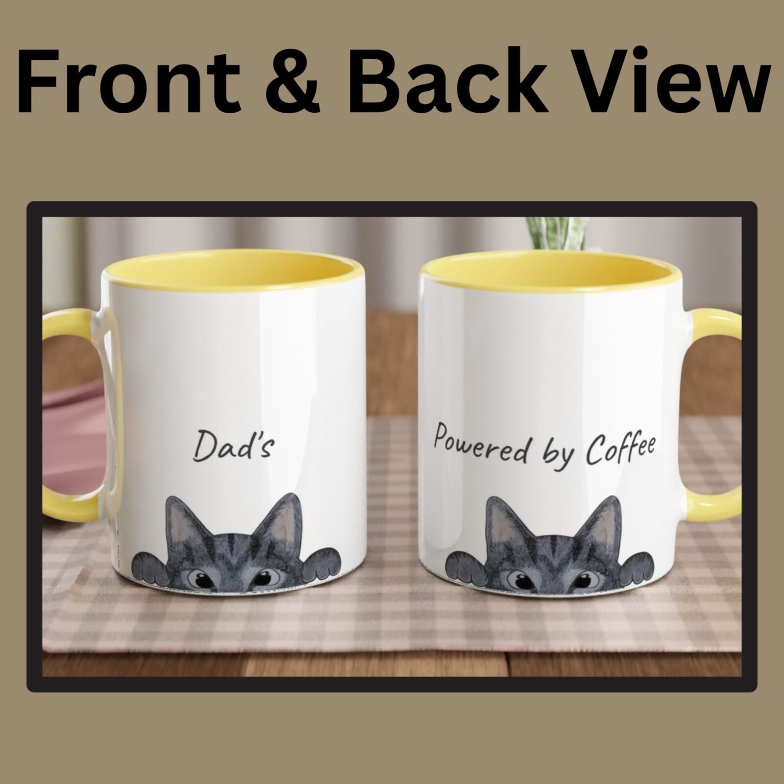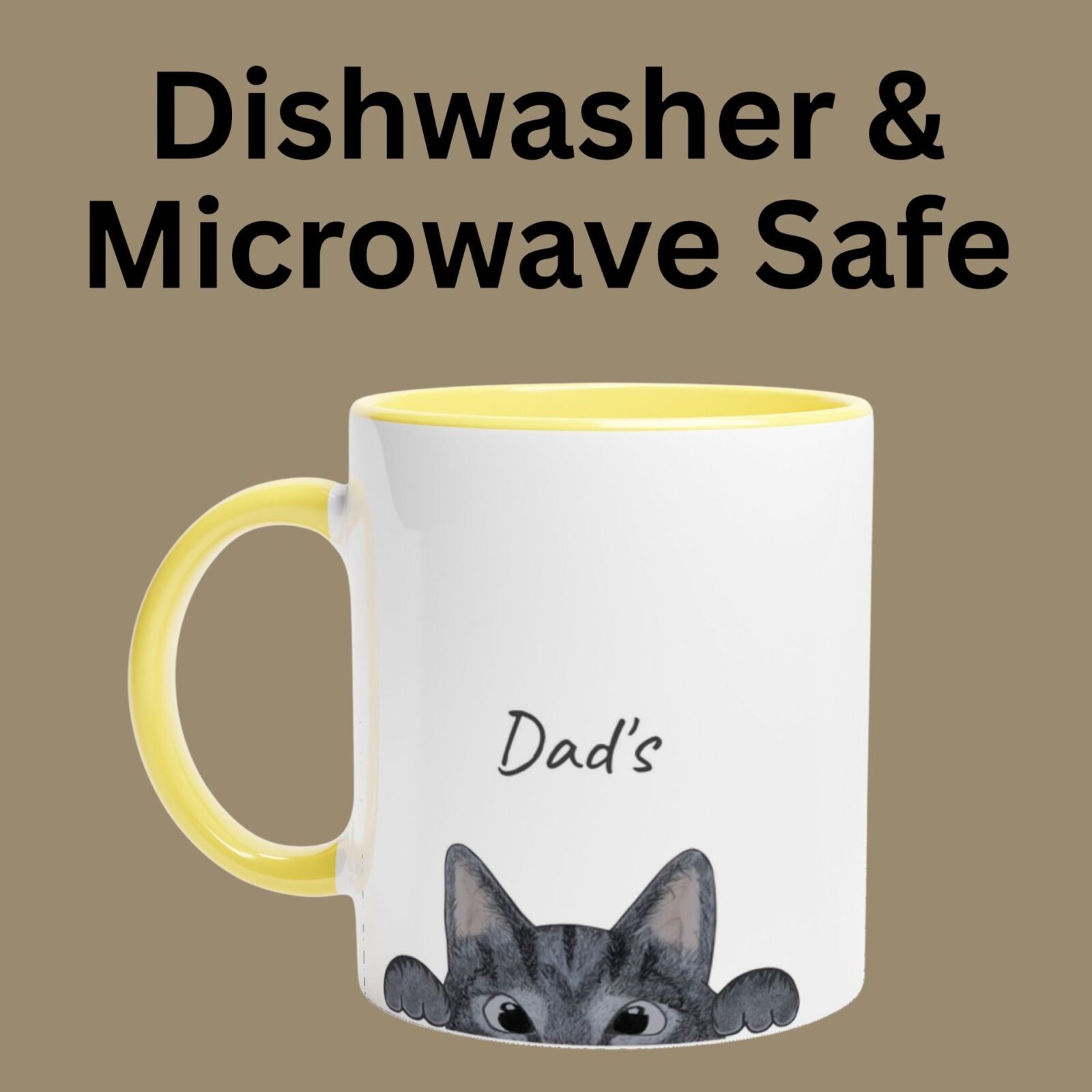 This 11 oz custom cat mug features a cute grey cat and your personalized text on the front side only. Made from my original artwork, it’s a glossy ceramic mug with a colored rim, inside, and handle—perfect for cat moms, cat dads, grandparents, or any feline fan!