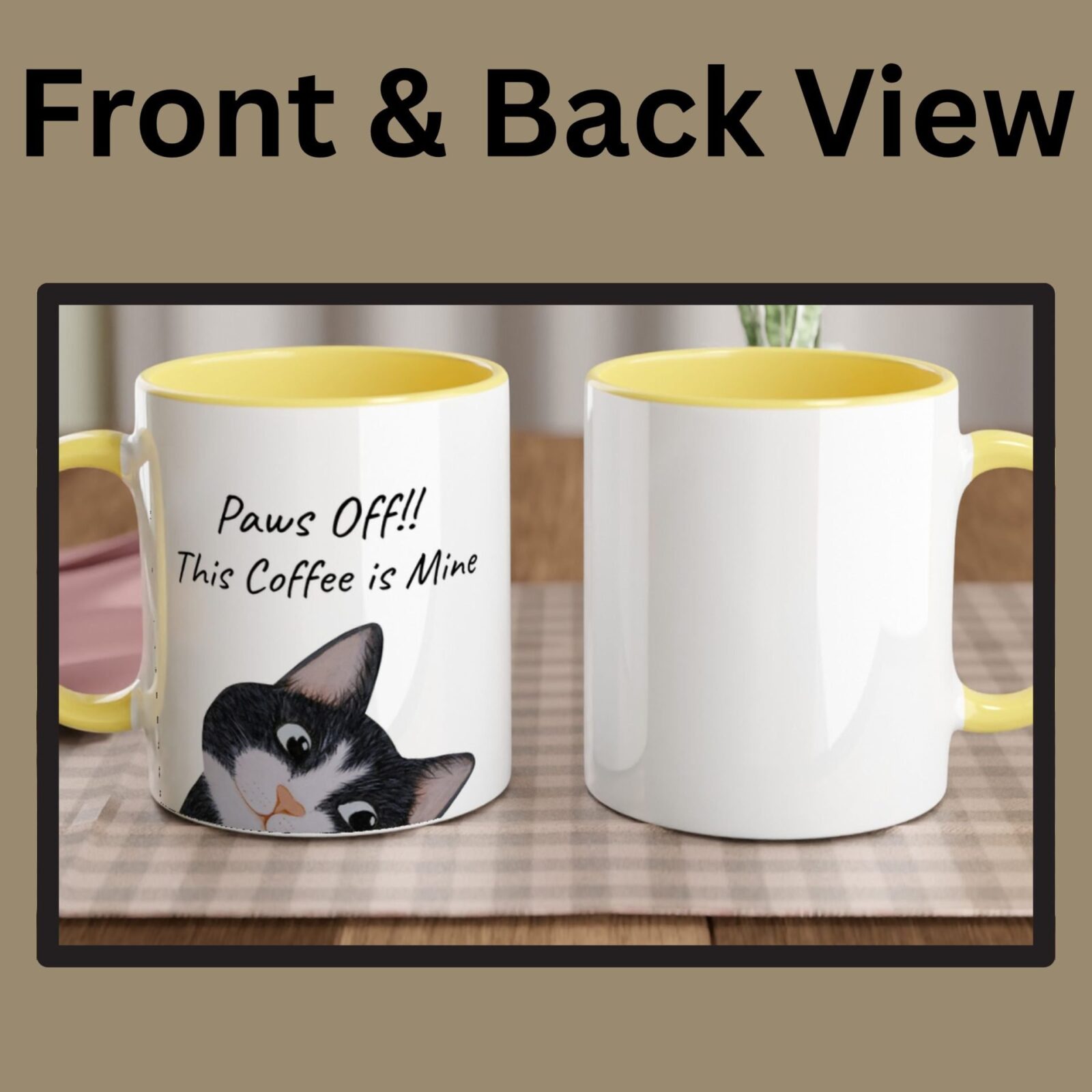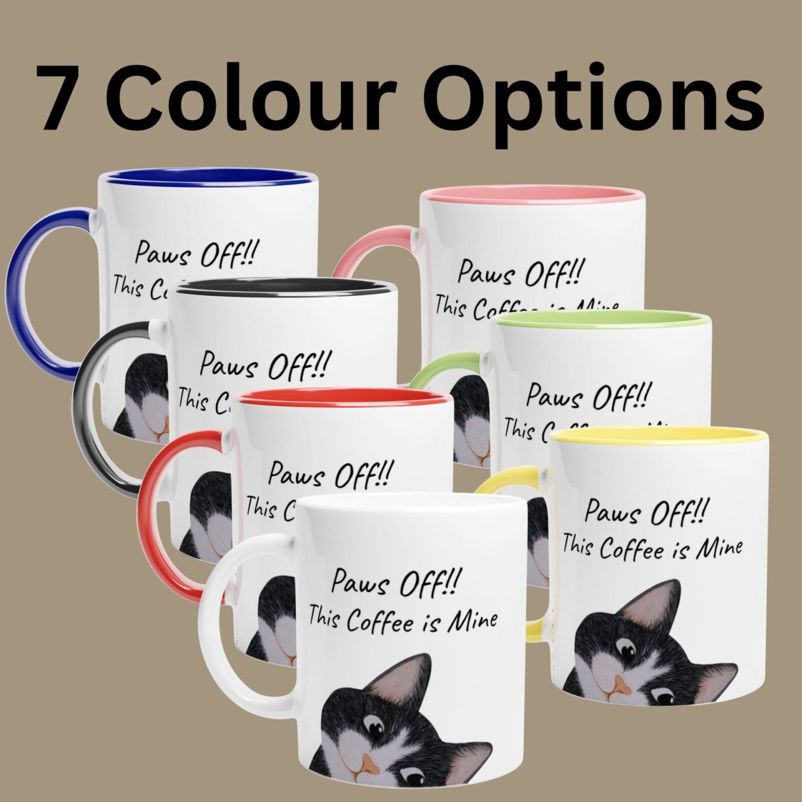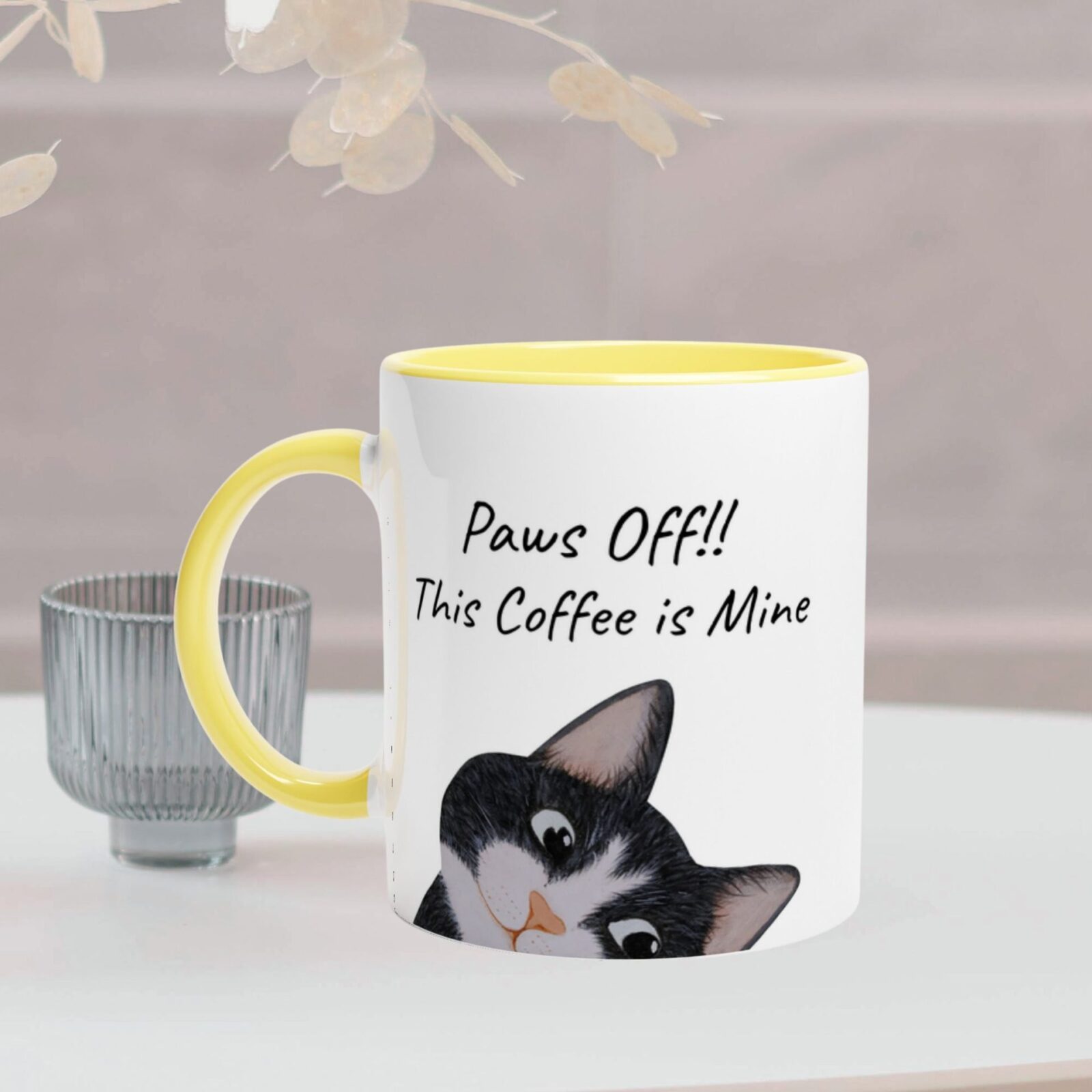 • 11 oz ceramic mug with tuxedo cat and “Paws off!! This coffee is mine” text
