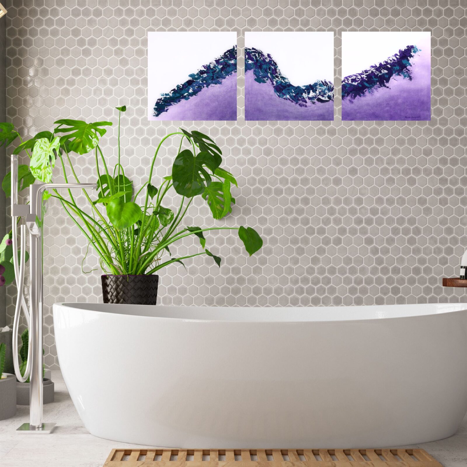 This triptych is perfectly suited for simpler settings, minimalist designs, and serene spaces that benefit from a calming yet artistic focal point. Its harmonious colors and flowing composition make it an ideal choice for a variety of interiors seeking an atmosphere of peace and subtle vibrancy. “Purple Haze” offers a unique blend of modern abstraction and serene beauty.
