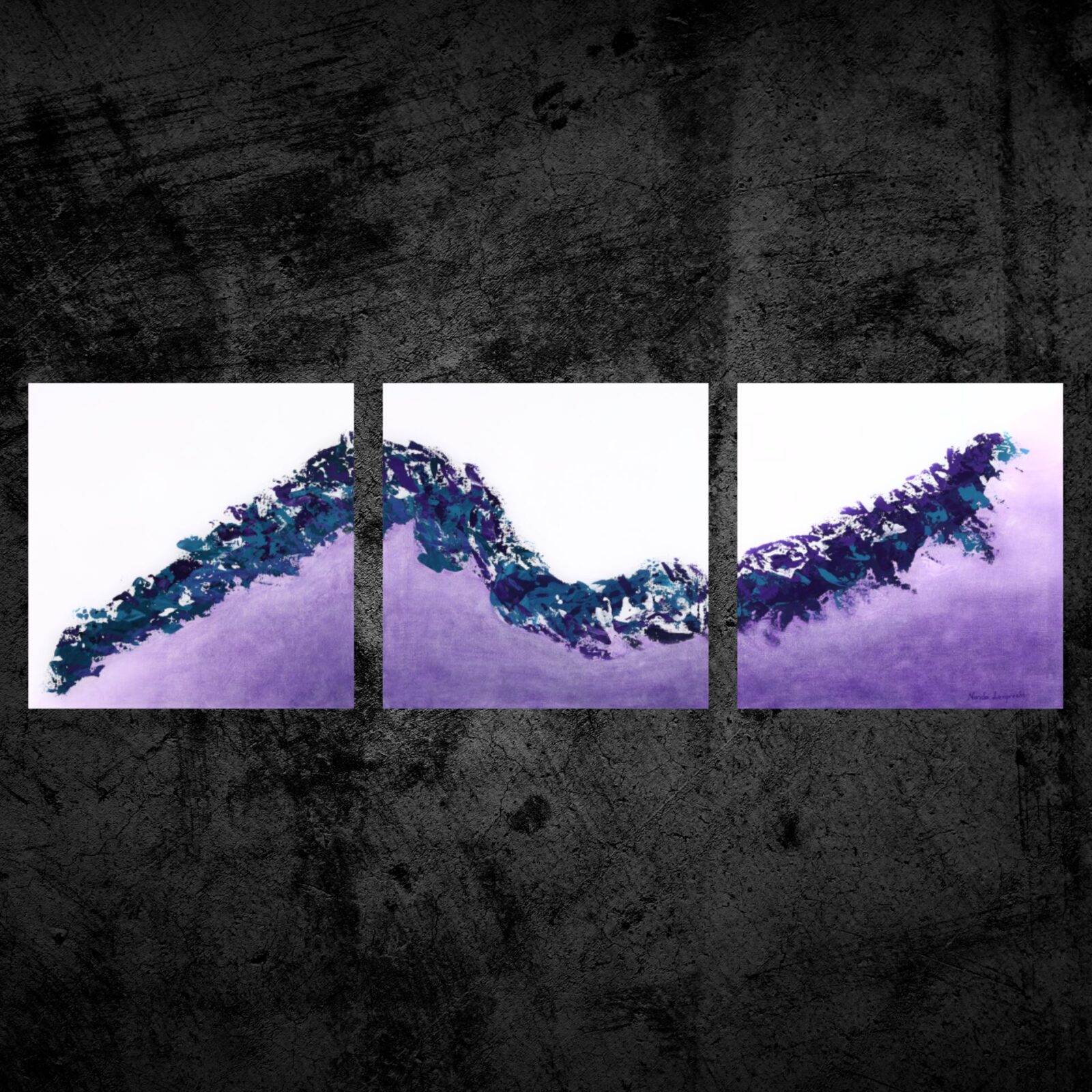 “Purple Haze” is inspired by the concept of a journey, translating its essence into a serene yet textured abstract form. Each panel features pure, crisp white at the top, seamlessly blending into a soothing purple shading below. Traversing the panels is a distinctive wavy divider section, rendered in a rich palette of deep and dark teal blue and purple hues, subtly accented with hints of black.