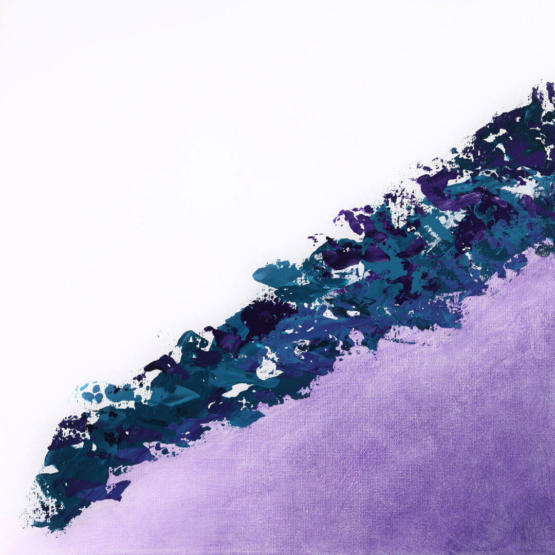 “Purple Haze” is inspired by the concept of a journey, translating its essence into a serene yet textured abstract form. Each panel features pure, crisp white at the top, seamlessly blending into a soothing purple shading below. Traversing the panels is a distinctive wavy divider section, rendered in a rich palette of deep and dark teal blue and purple hues, subtly accented with hints of black.