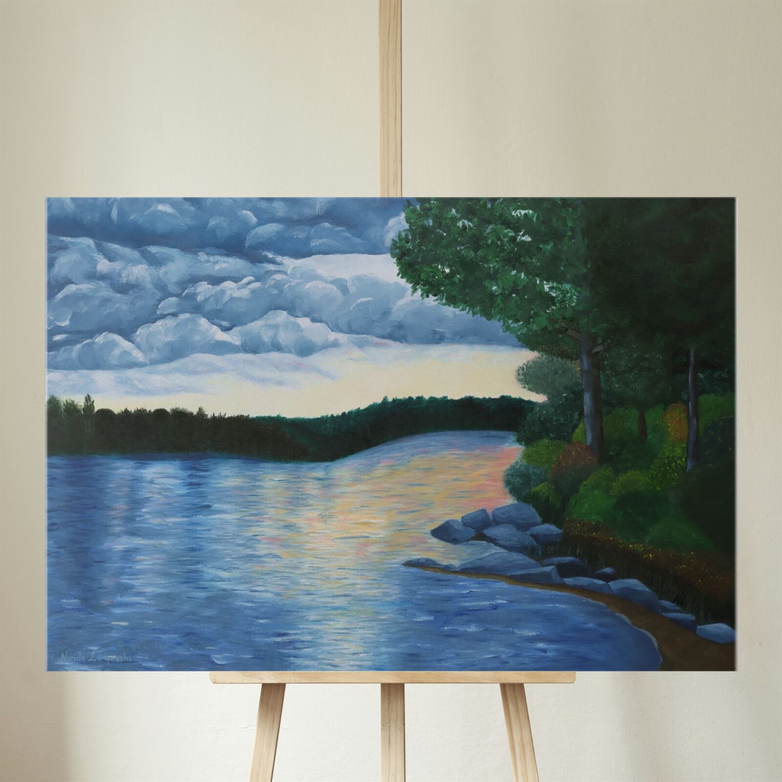 Experience the dramatic beauty of Algonquin Park with “Silence Before the Storm,” an original 18″ x 24″ oil painting by Nanda. This captivating landscape captures a summer sky full of dark grey clouds, with muted yellow-orange sunset reflections on the lake, hinting at the power of nature just before a storm breaks.