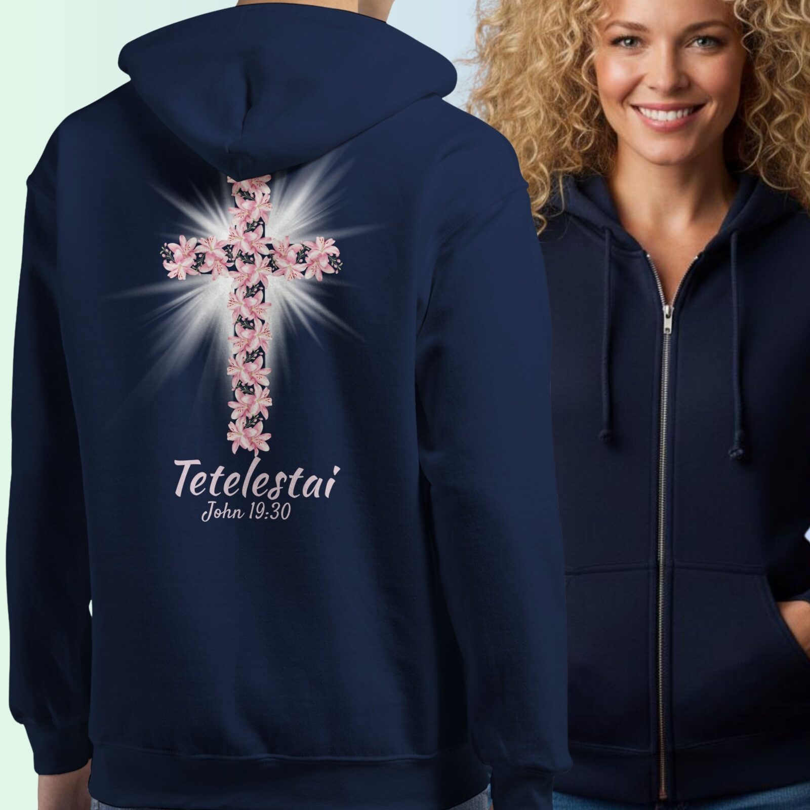 This women’s Christian zip hoodie features a cross and lilies design with the powerful scripture text “Tetelestai, John 19:30,” meaning “It is finished.” This verse represents the fulfilment of Christ’s sacrifice and makes this hoodie a meaningful statement of faith.