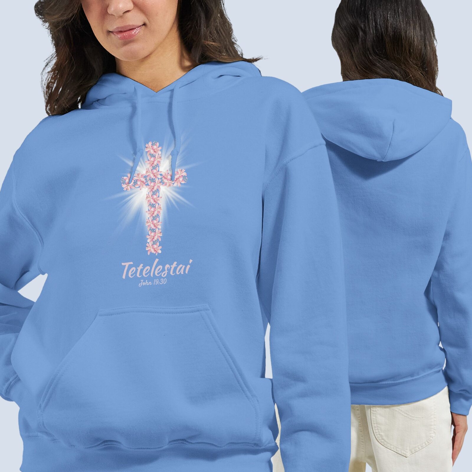 This Tetelestai Christian hoodie for women features a symbolic cross and lilies design with the scripture John 19:30, representing Christ’s completed sacrifice and victory. Made from a soft 50% cotton / 50% polyester blend, this faith pullover hoodie delivers warmth, comfort, and durability for everyday wear.