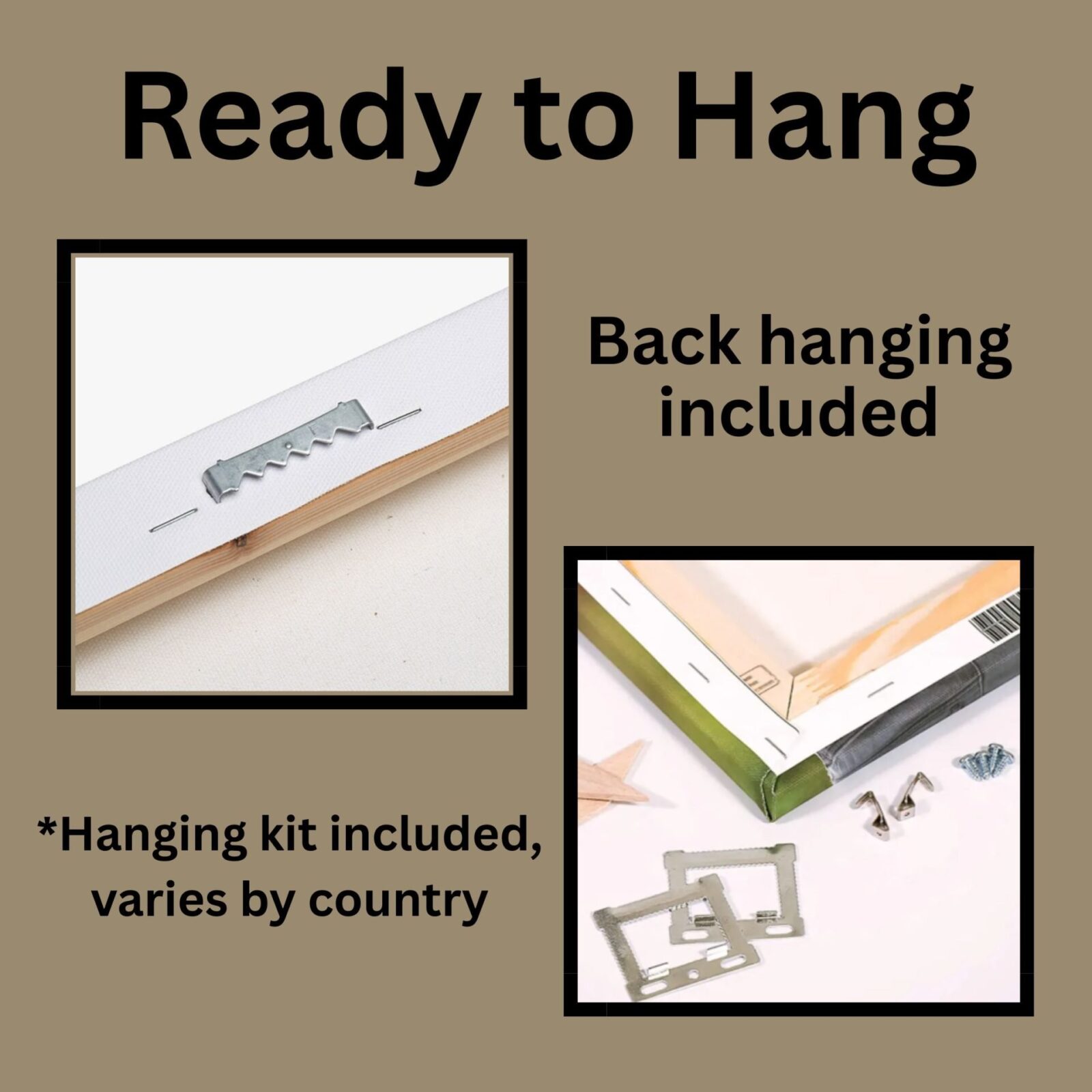 Each art print is made with care using a premium cotton-polyester blend canvas (300–350 gsm, 350–400 microns thick) for rich colour depth and lasting quality. Choose between slim (2cm/0.75in) or thick (4cm/ 1.5in) gallery-style frames, crafted from responsibly sourced FSC-certified wood stretcher bars. Whether you opt for a minimalist display or a statement-making accent, your canvas print will arrive ready to hang with a sturdy hanging kit included (design varies by country).